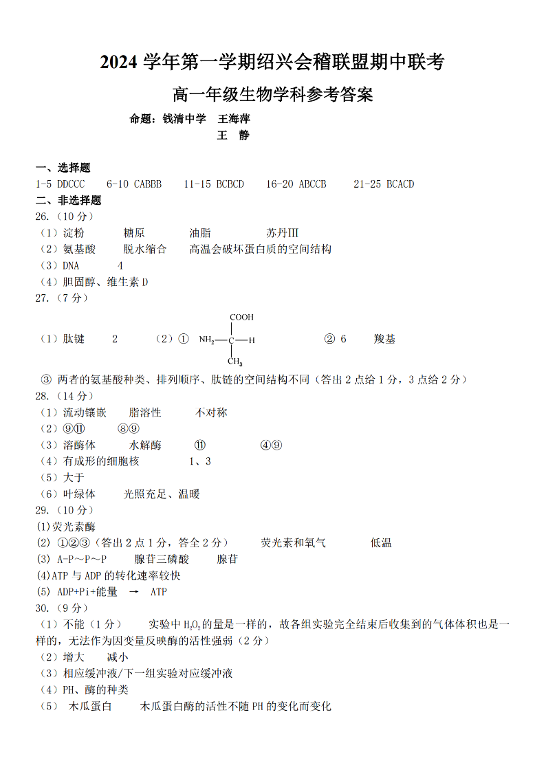 绍兴会稽联盟2024学年高一第一学期期中联考 生物答案