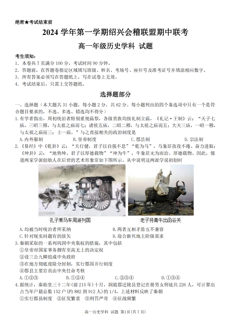 绍兴会稽联盟2024学年高一第一学期期中联考 历史