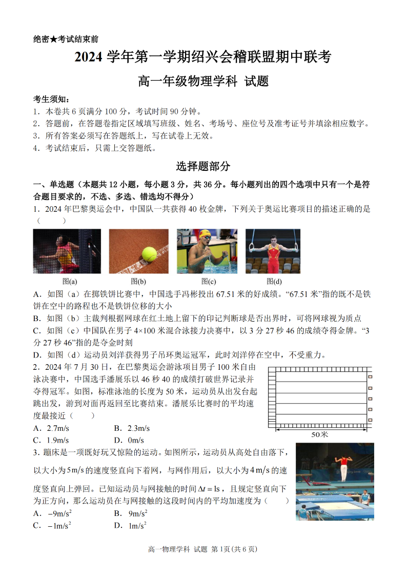绍兴会稽联盟2024学年高一第一学期期中联考 物理