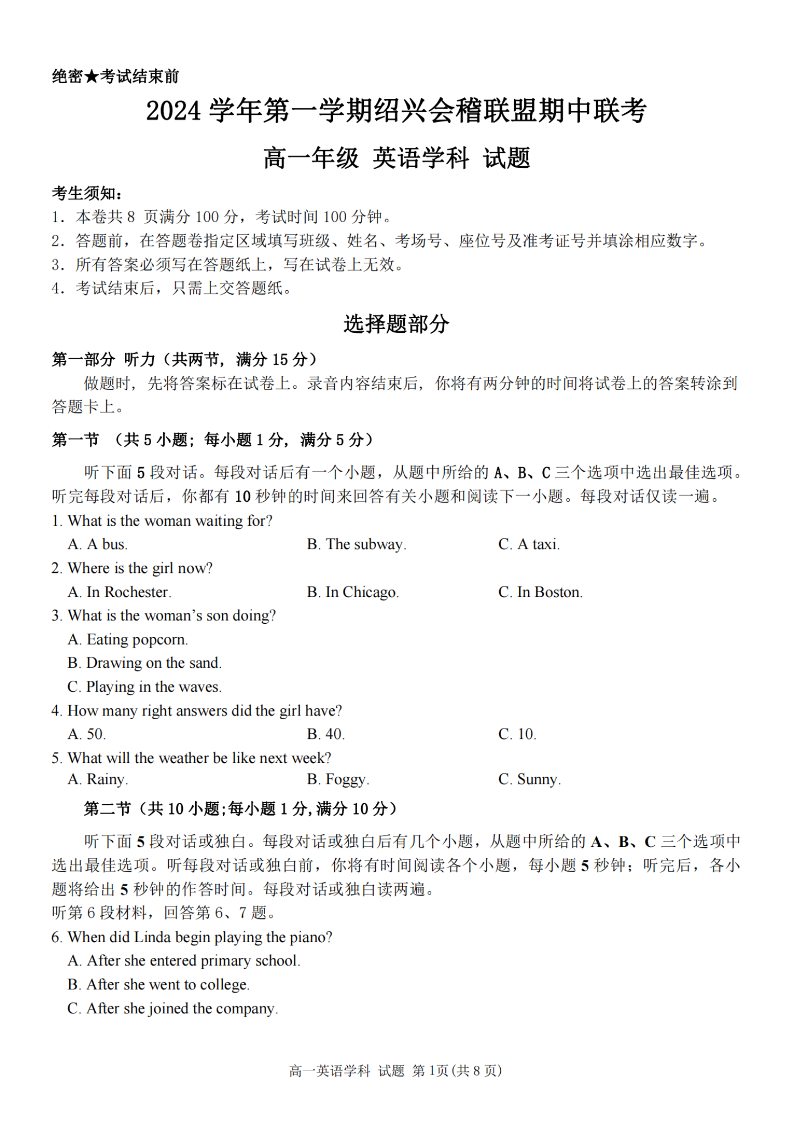 绍兴会稽联盟2024学年高一第一学期期中联考 英语