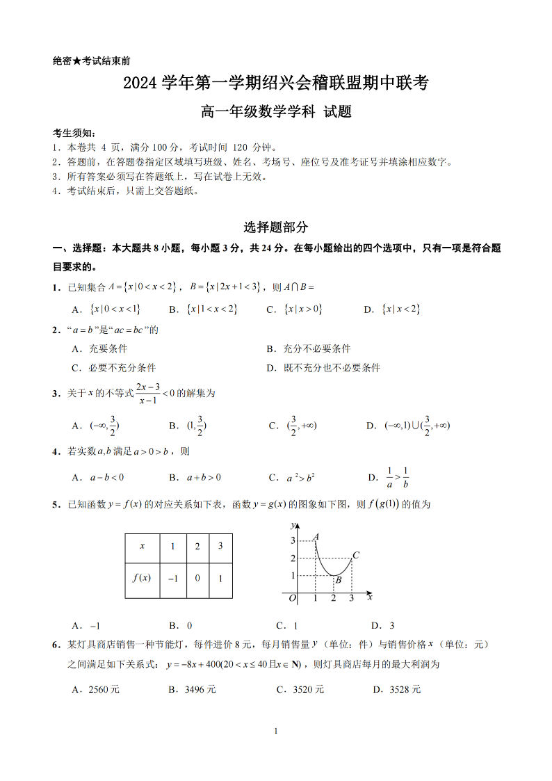 绍兴会稽联盟2024学年高一第一学期期中联考 数学