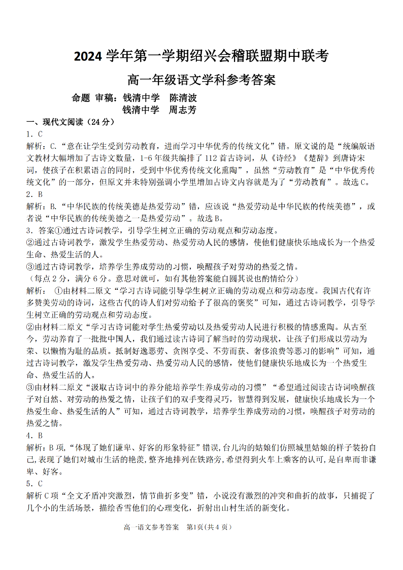 绍兴会稽联盟2024学年高一第一学期期中联考 语文答案