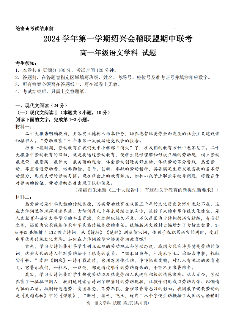 绍兴会稽联盟2024学年高一第一学期期中联考 语文