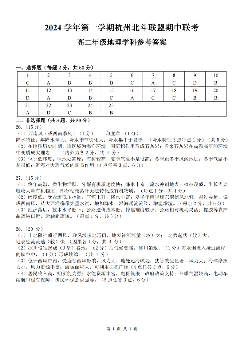 杭州北斗联盟2024学年高二第一学期期中联考 地理答案