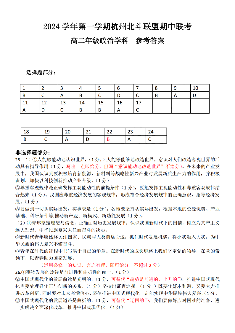 杭州北斗联盟2024学年高二第一学期期中联考 政治答案