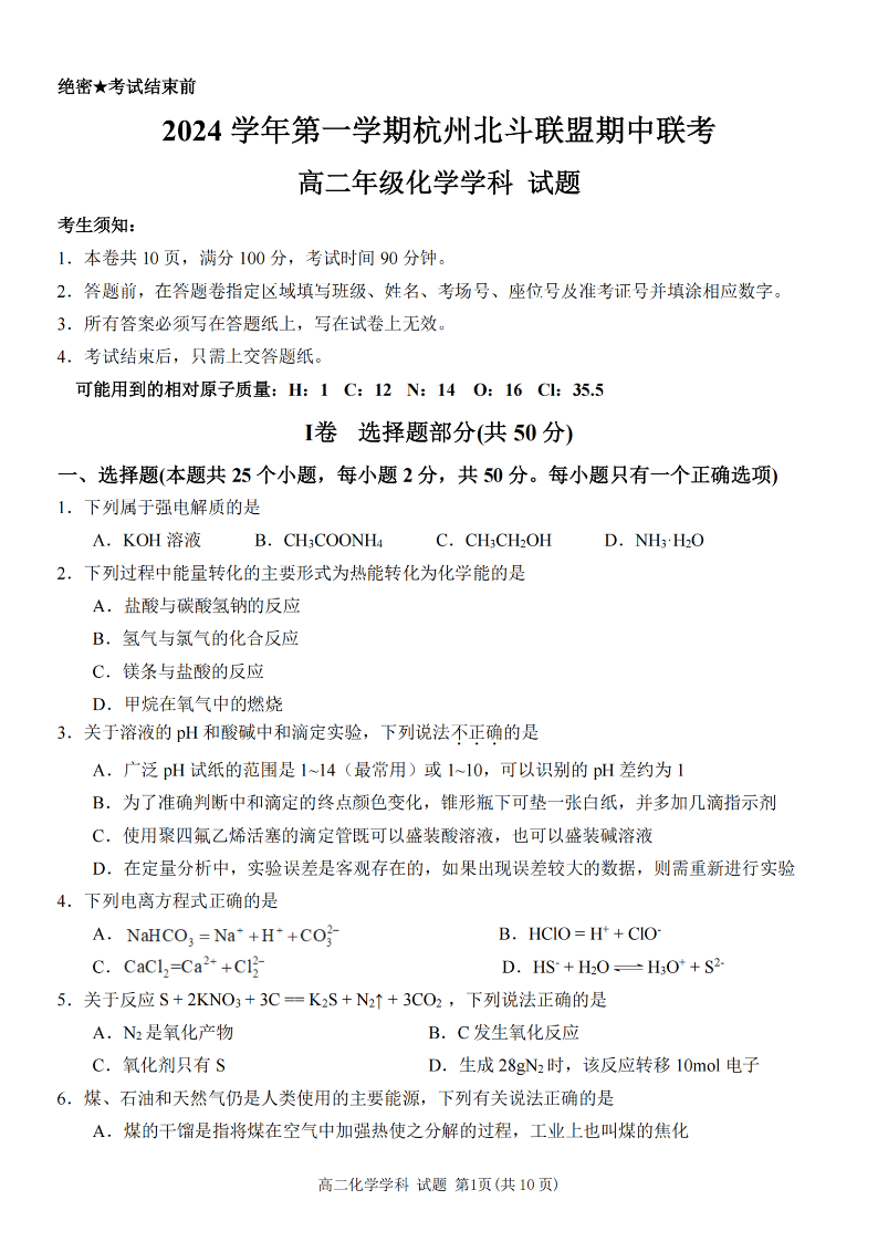 杭州北斗联盟2024学年高二第一学期期中联考 化学