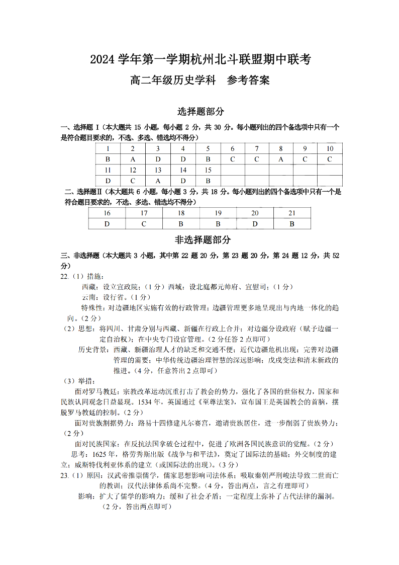 杭州北斗联盟2024学年高二第一学期期中联考 历史答案