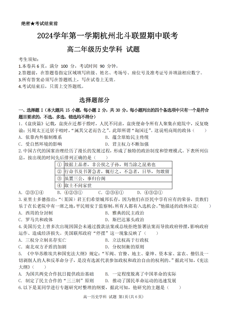 杭州北斗联盟2024学年高二第一学期期中联考 历史