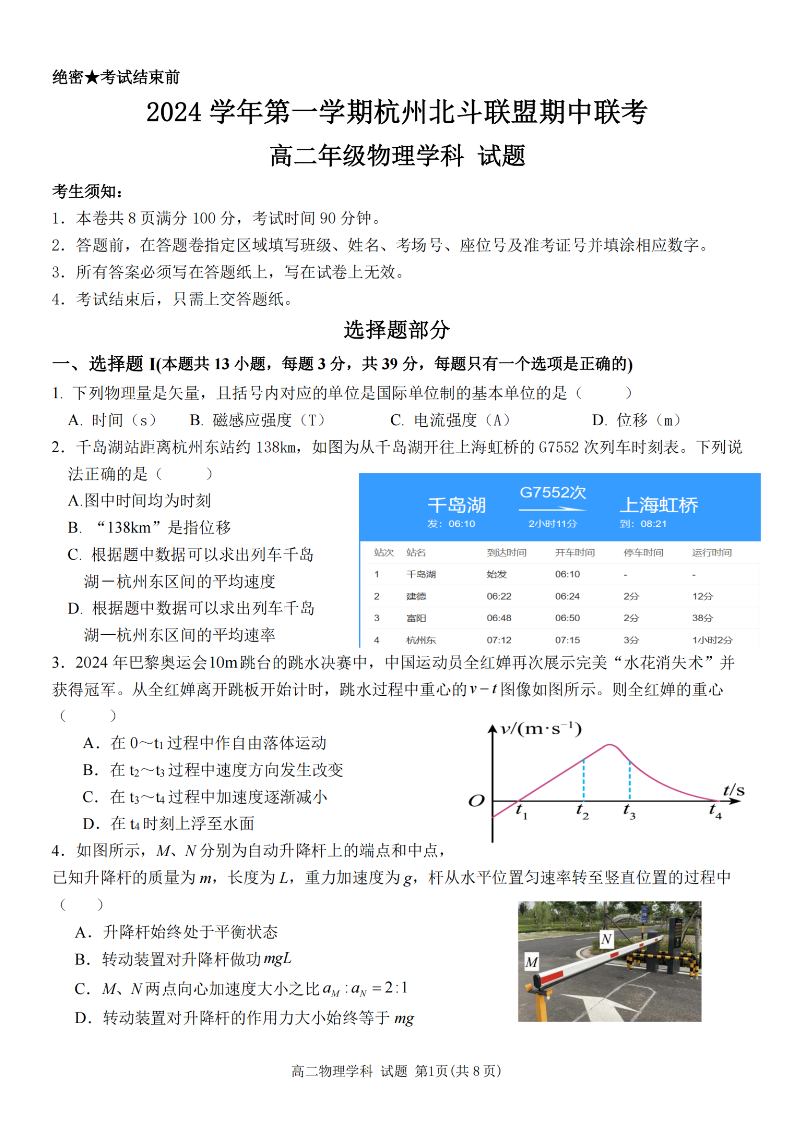 杭州北斗联盟2024学年高二第一学期期中联考 物理
