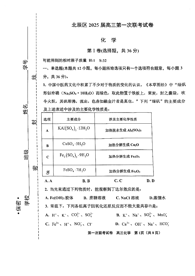 天津市北辰区2024-2025学年高三上学期期中考试 化学