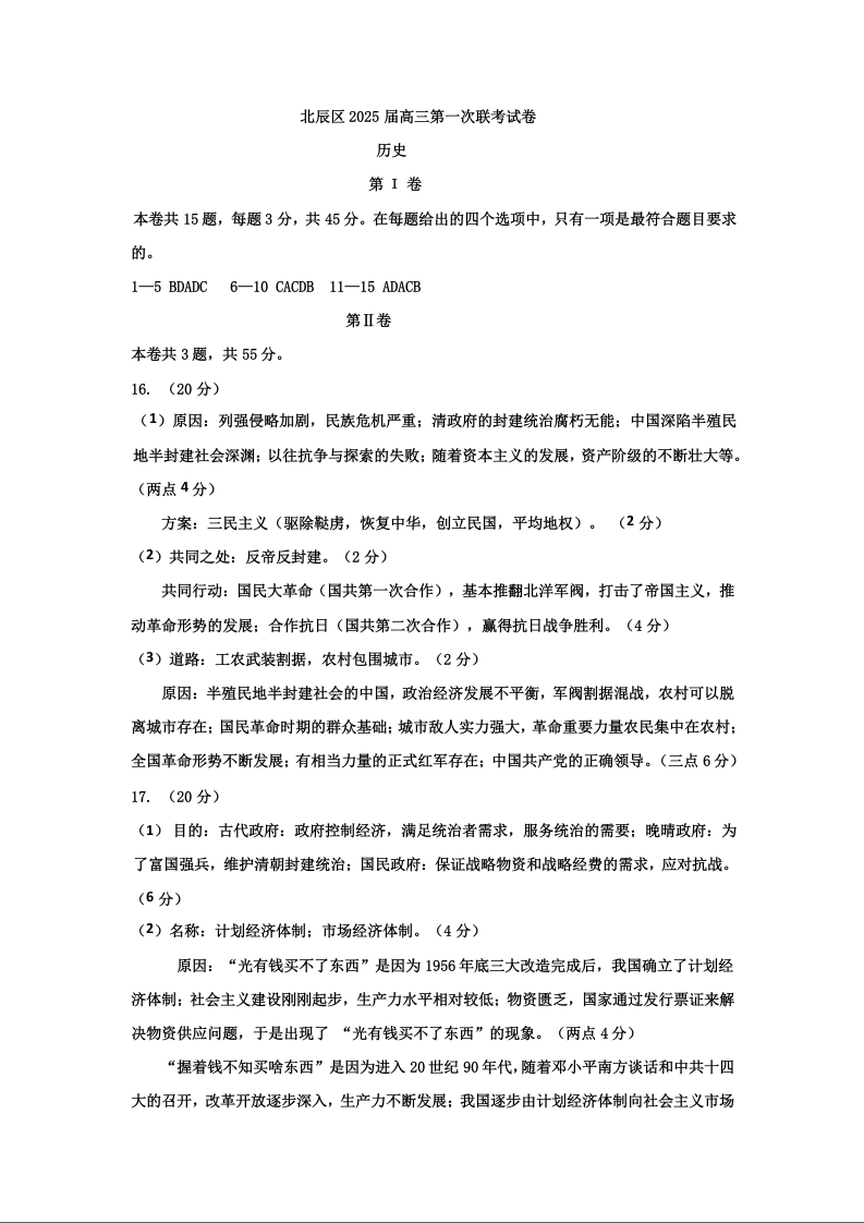 天津市北辰区2024-2025学年高三上学期期中考试 历史答案