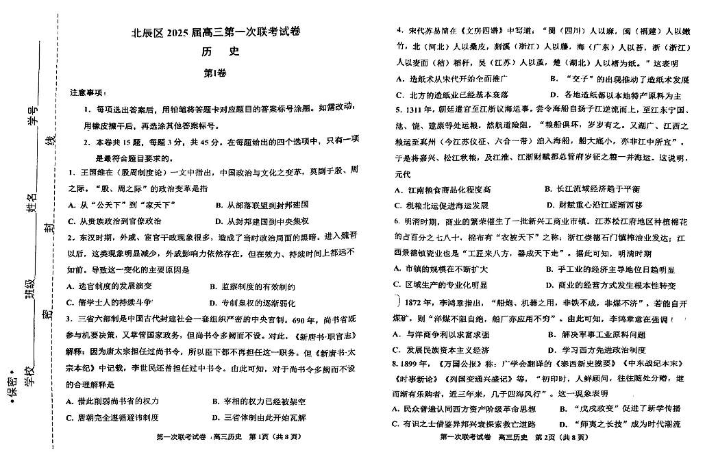 天津市北辰区2024-2025学年高三上学期期中考试 历史