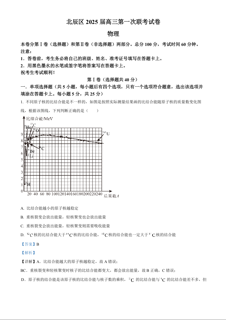 天津市北辰区2024-2025学年高三上学期期中考试 物理答案