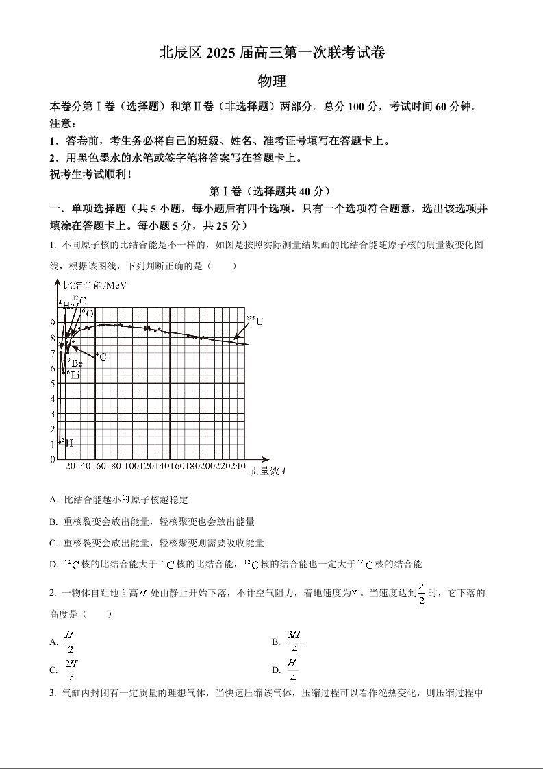 天津市北辰区2024-2025学年高三上学期期中考试 物理