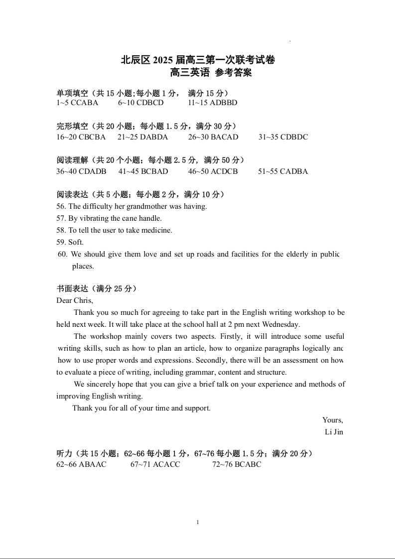 天津市北辰区2024-2025学年高三上学期期中考试 英语答案