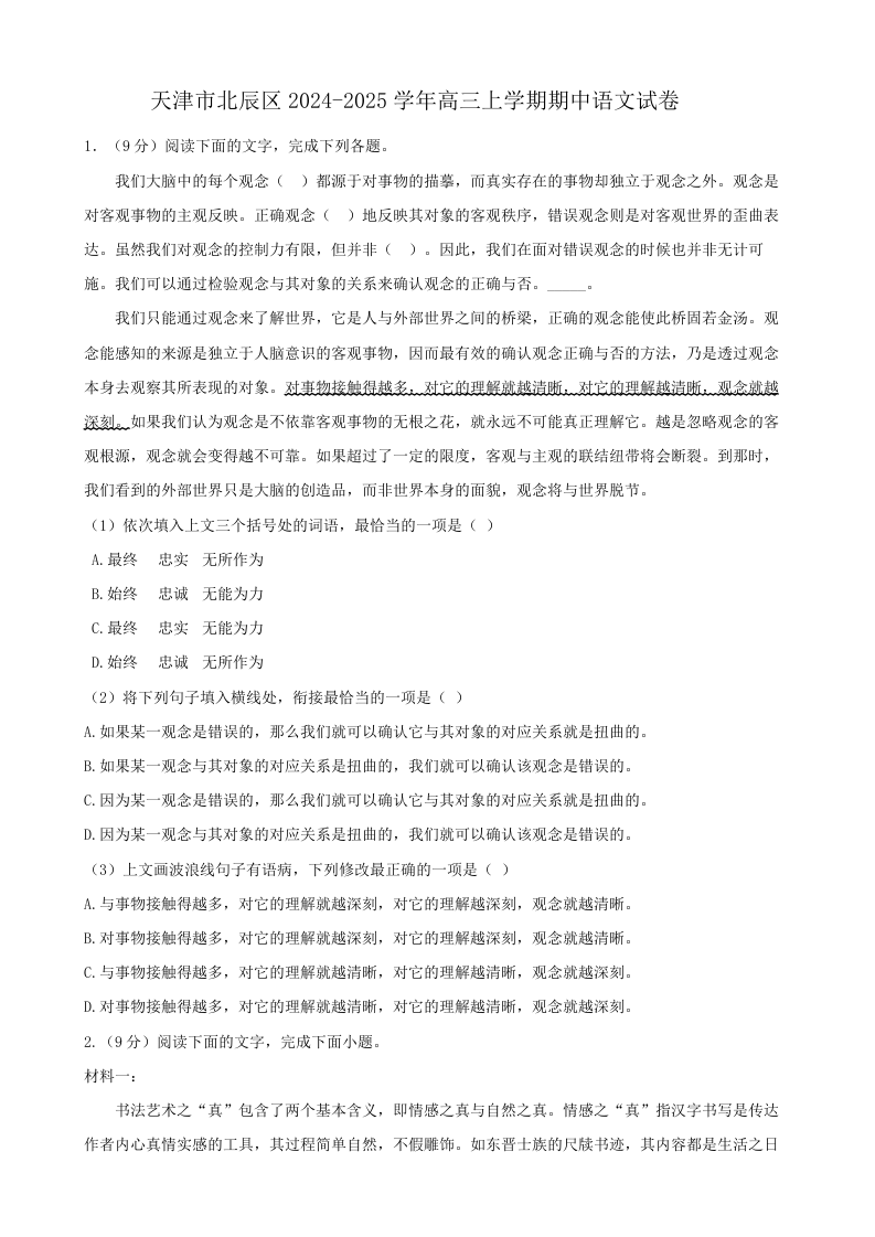 天津市北辰区2024-2025学年高三上学期期中考试 语文