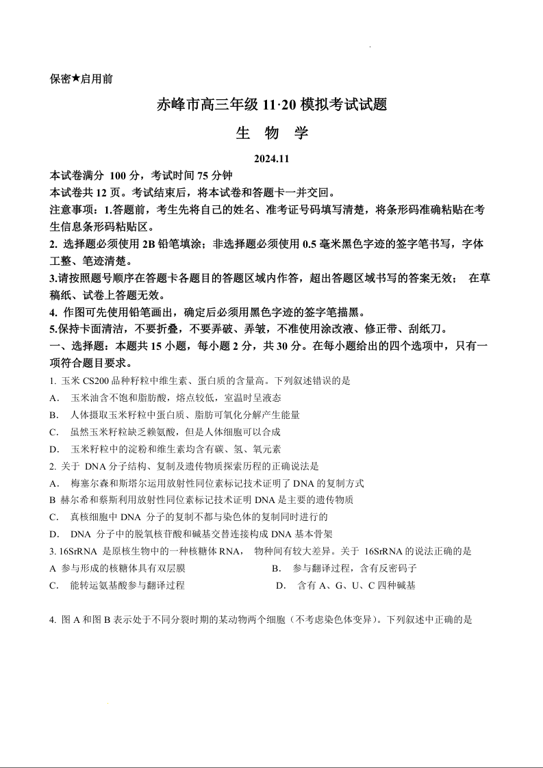 内蒙古自治区赤峰市2025届高三上学期11月期中考试 生物