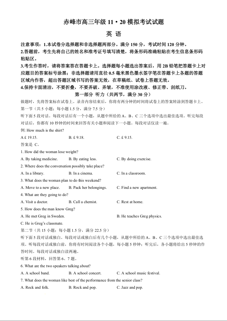 内蒙古自治区赤峰市2025届高三上学期11月期中考试 英语