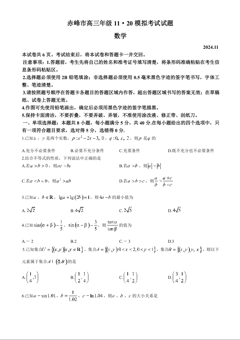 内蒙古自治区赤峰市2025届高三上学期11月期中考试 数学