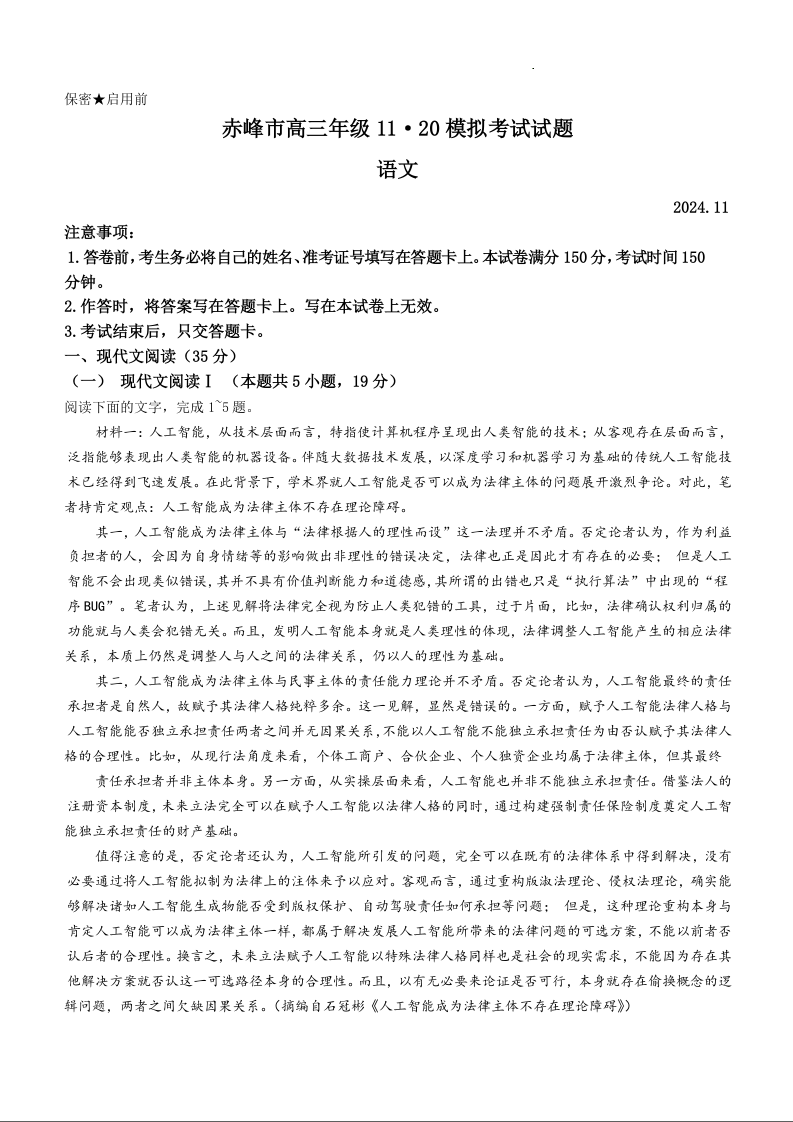 内蒙古自治区赤峰市2025届高三上学期11月期中考试 语文