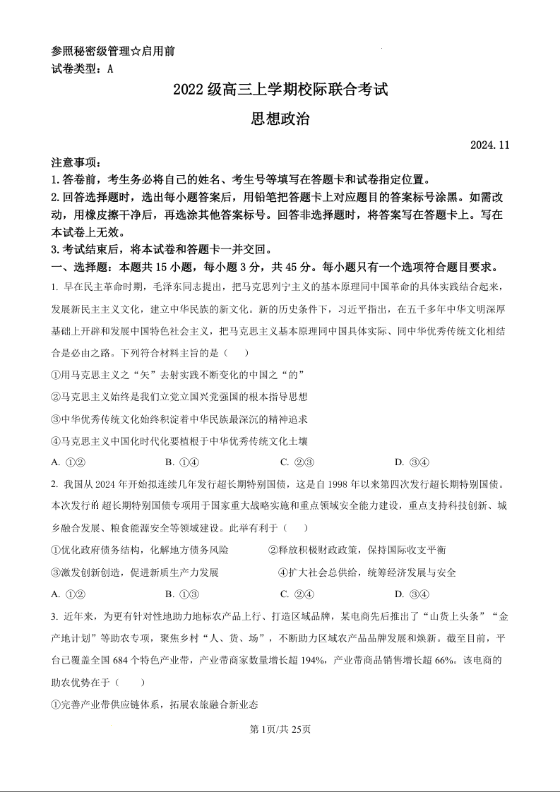 山东省日照市校际联合考试2025届高三上学期11月期中考试 政治