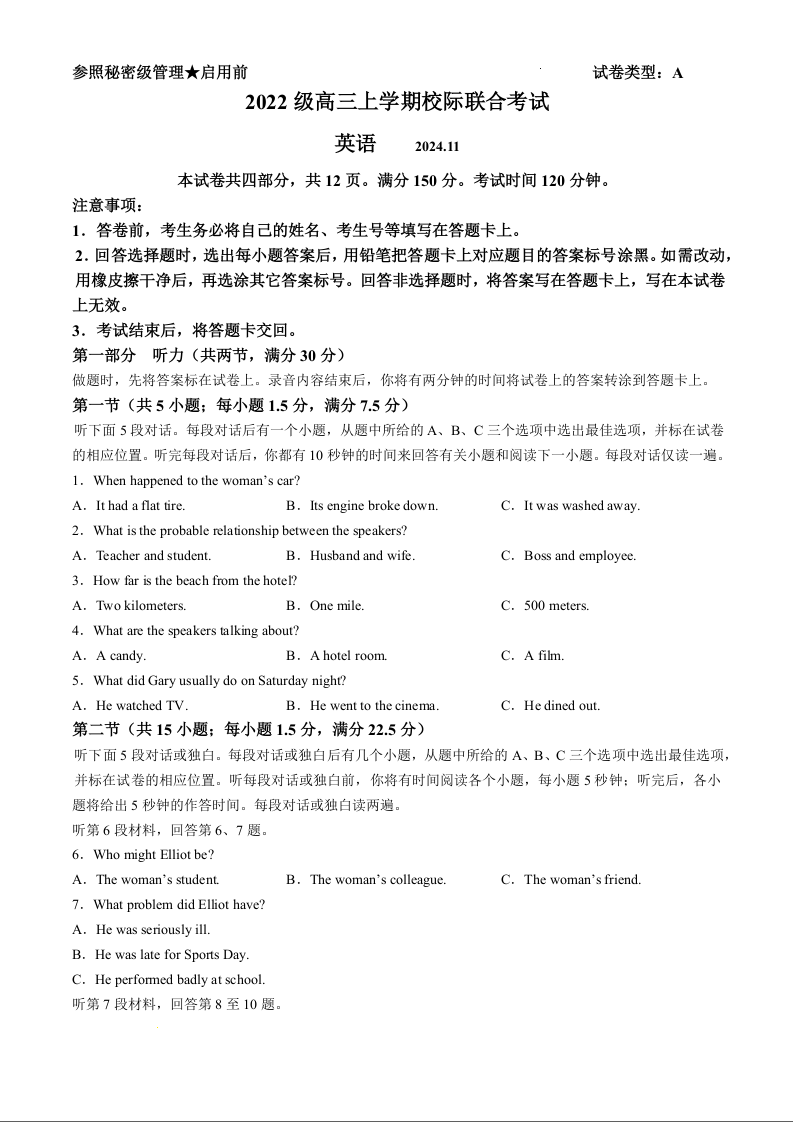 山东省日照市校际联合考试2025届高三上学期11月期中考试 英语