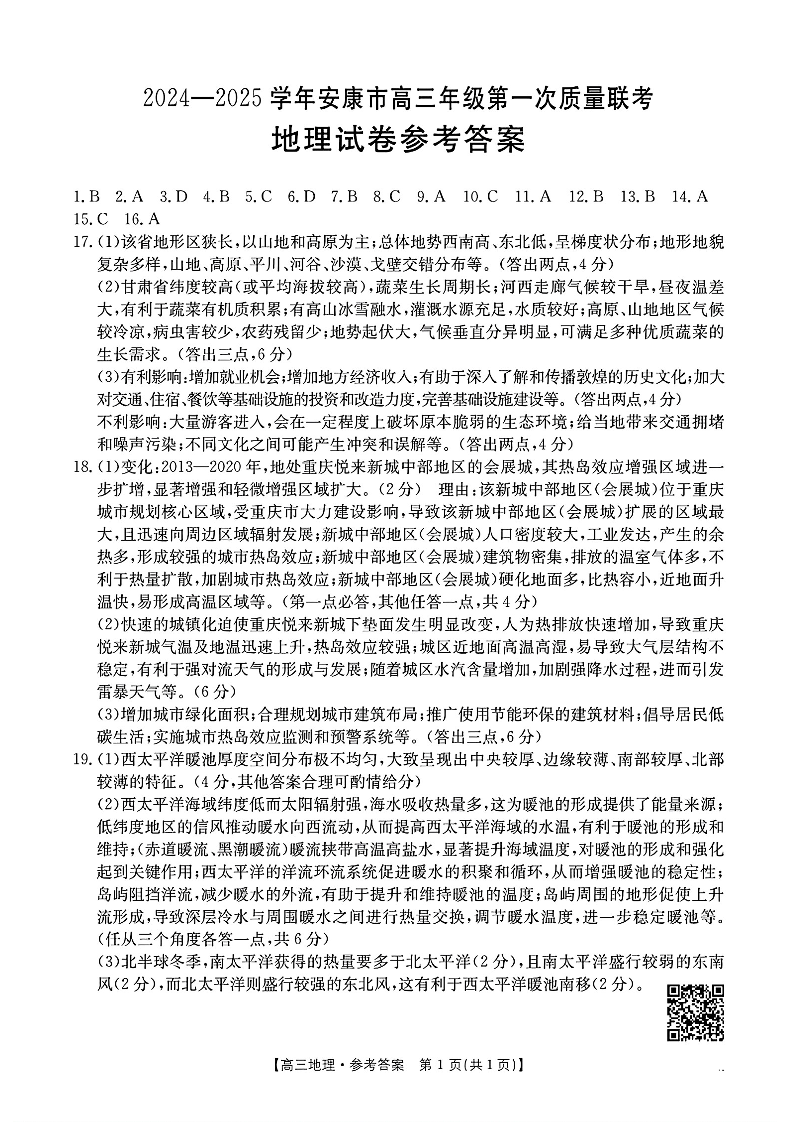 陕西省安康市2024-2025学年高三上学期第一次质量联考 地理答案