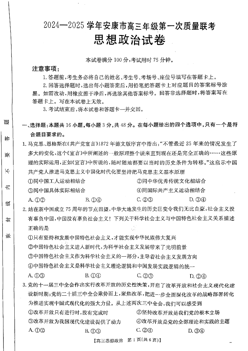 陕西省安康市2024-2025学年高三上学期第一次质量联考 政治