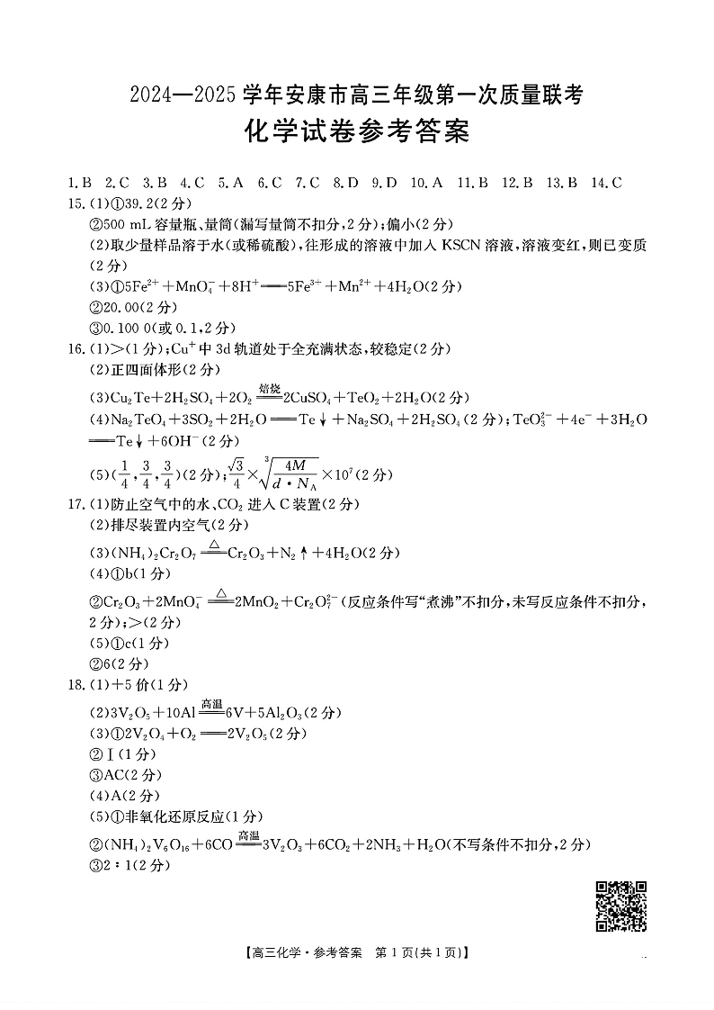 陕西省安康市2024-2025学年高三上学期第一次质量联考 化学答案