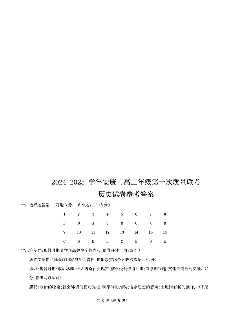 陕西省安康市2024-2025学年高三上学期第一次质量联考 历史答案