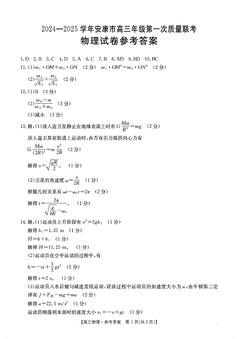 陕西省安康市2024-2025学年高三上学期第一次质量联考 物理答案