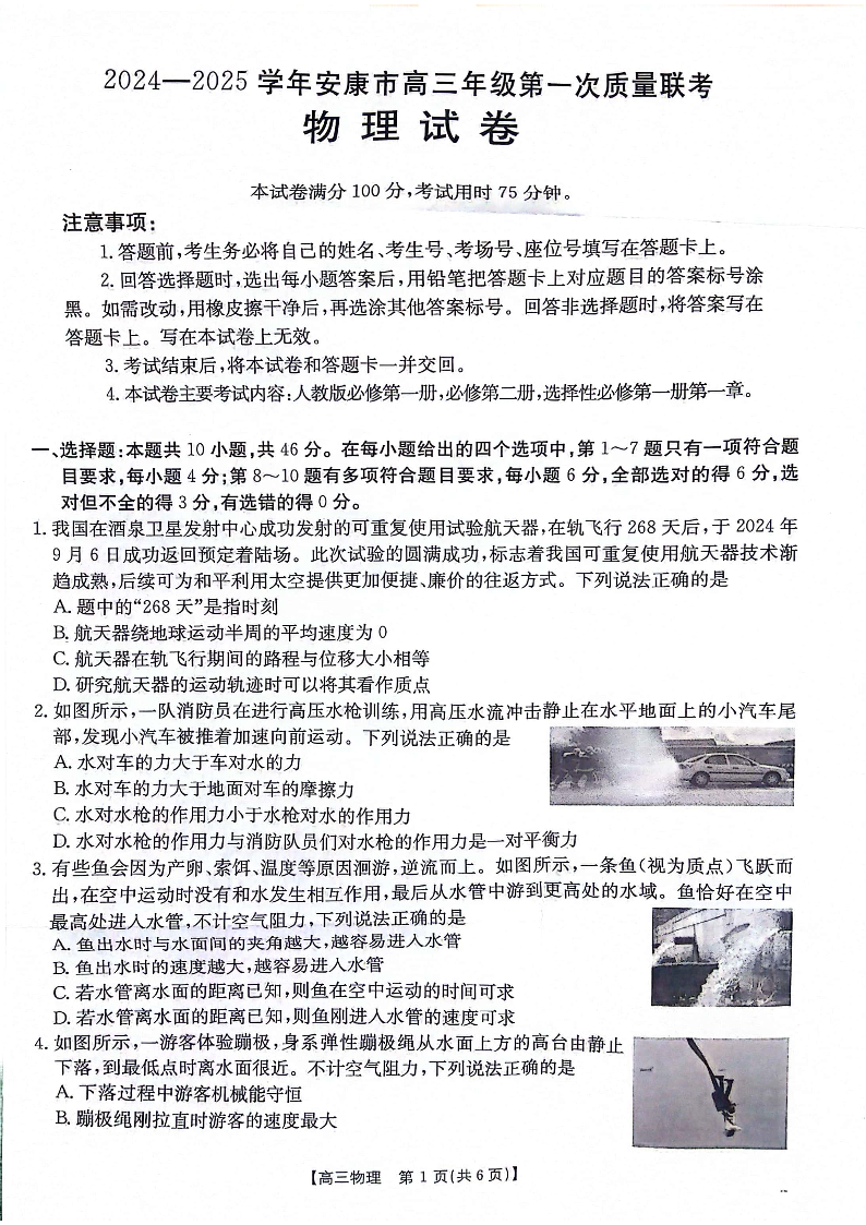 陕西省安康市2024-2025学年高三上学期第一次质量联考 物理