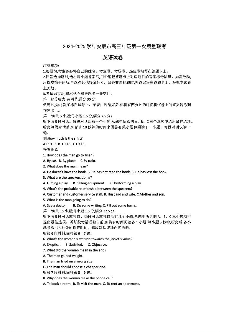 陕西省安康市2024-2025学年高三上学期第一次质量联考 英语