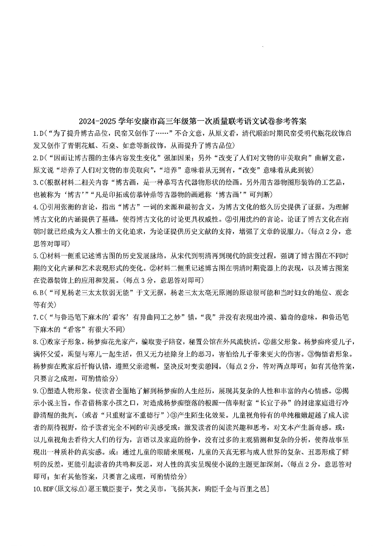 陕西省安康市2024-2025学年高三上学期第一次质量联考 语文答案