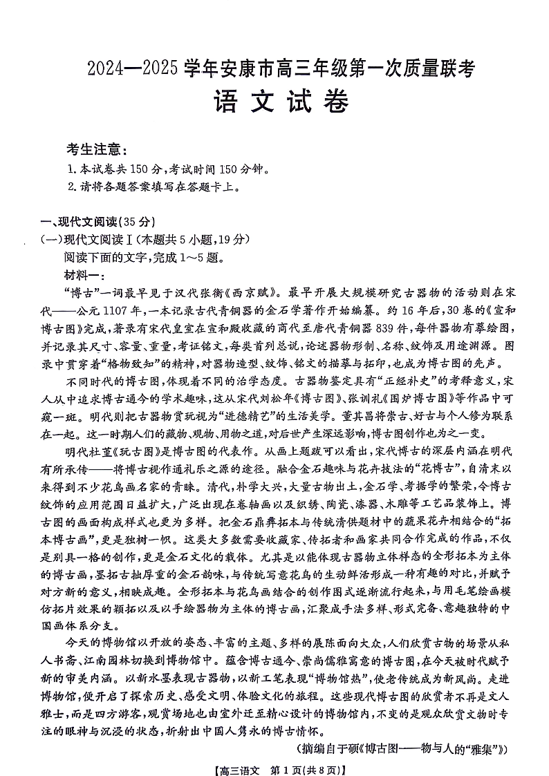 陕西省安康市2024-2025学年高三上学期第一次质量联考 语文