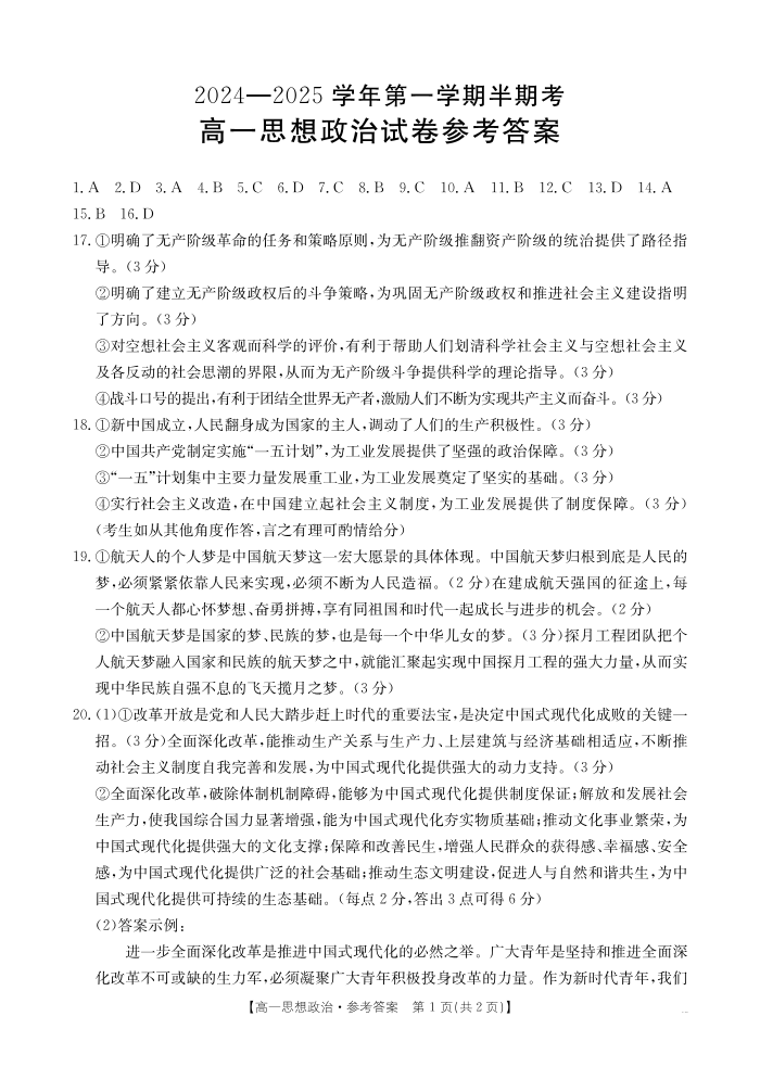 福建省龙岩市非一级达标校2024-2025学年高二上学期11月期中考试 政治答案