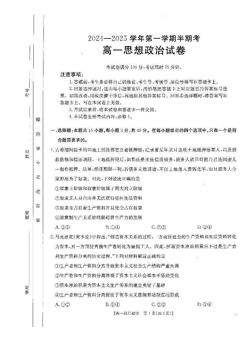 福建省龙岩市非一级达标校2024-2025学年高二上学期11月期中考试 政治