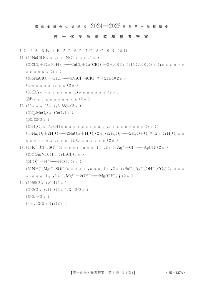 福建省龙岩市非一级达标校2024-2025学年高二上学期11月期中考试 化学答案