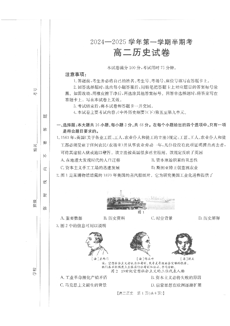 福建省龙岩市非一级达标校2024-2025学年高二上学期11月期中考试 历史