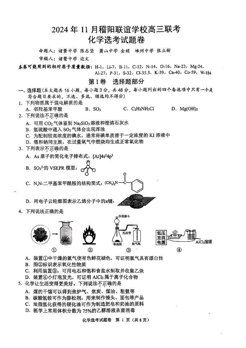 浙江省稽阳联谊学校2024-2025学年高三上学期11月月考 化学