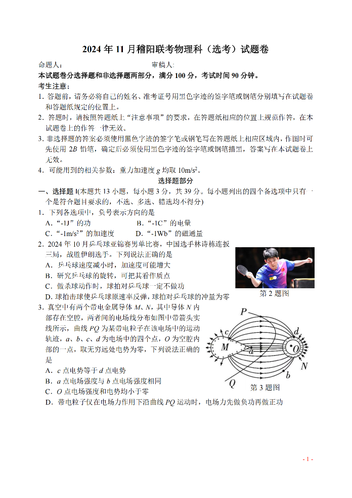 浙江省稽阳联谊学校2024-2025学年高三上学期11月月考 物理