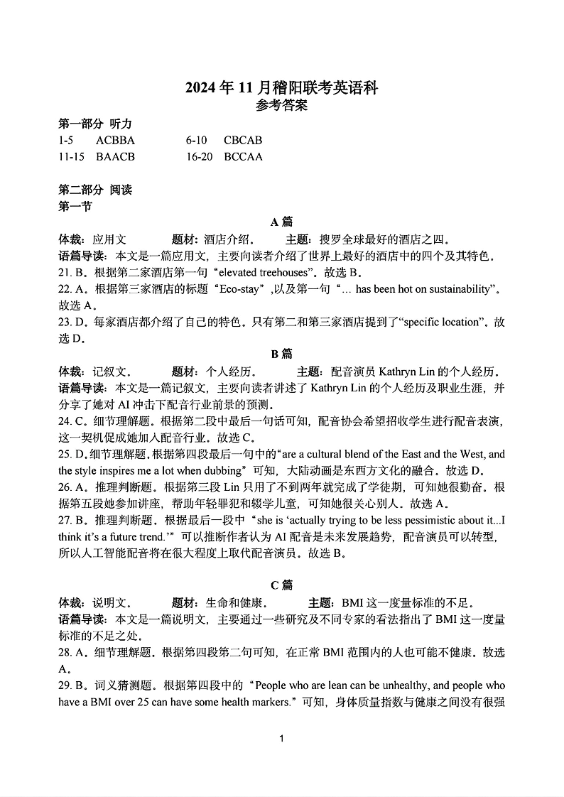 浙江省稽阳联谊学校2024-2025学年高三上学期11月月考 英语答案