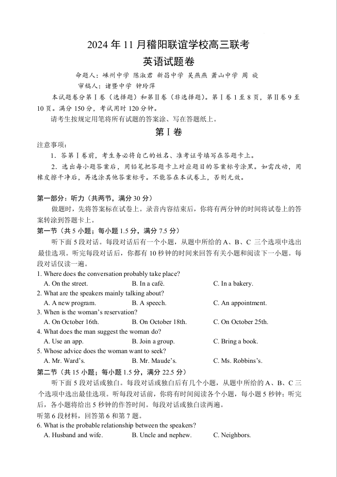 浙江省稽阳联谊学校2024-2025学年高三上学期11月月考 英语