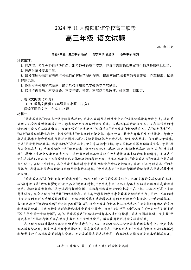 浙江省稽阳联谊学校2024-2025学年高三上学期11月月考 语文