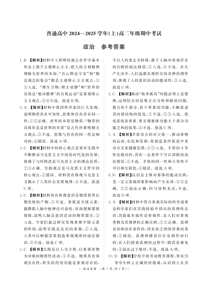 河南省普通高中2024—2025学年(上)高二年级期中考试 政治答案