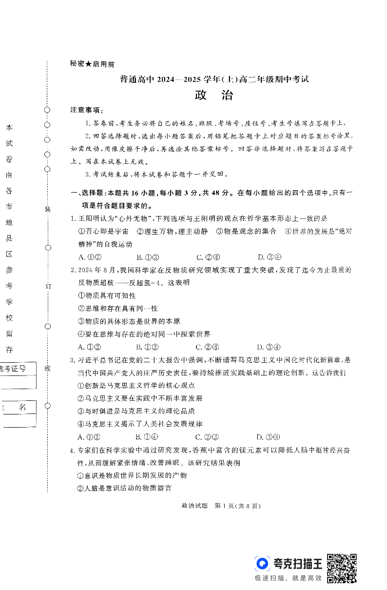 河南省普通高中2024—2025学年(上)高二年级期中考试 政治