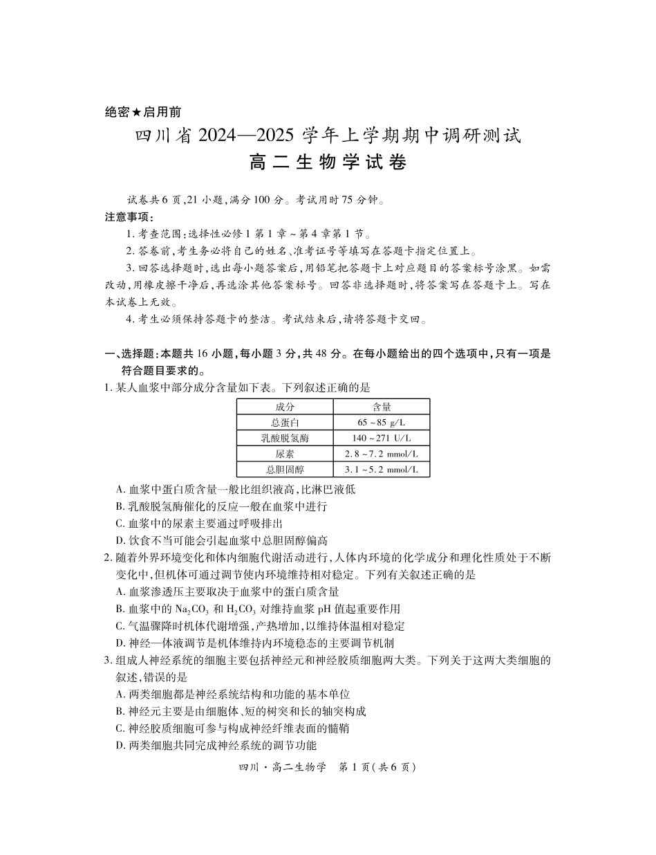 四川省2024-2025学年高二上学期期中调研测试 生物