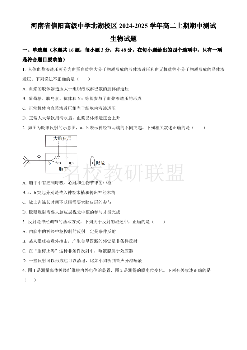 河南省信阳高级中学北湖校区2024-2025学年高二上学期期中考试 生物