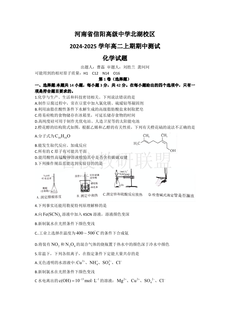 河南省信阳高级中学北湖校区2024-2025学年高二上学期期中考试 化学