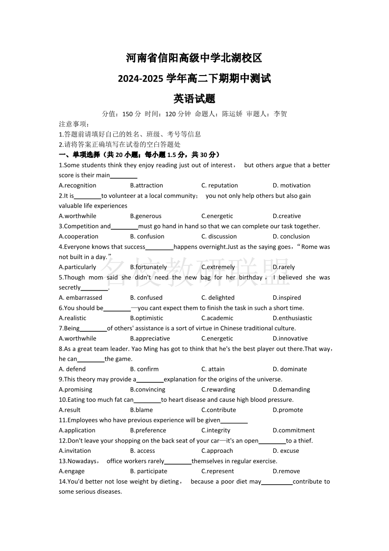 河南省信阳高级中学北湖校区2024-2025学年高二上学期期中考试 英语